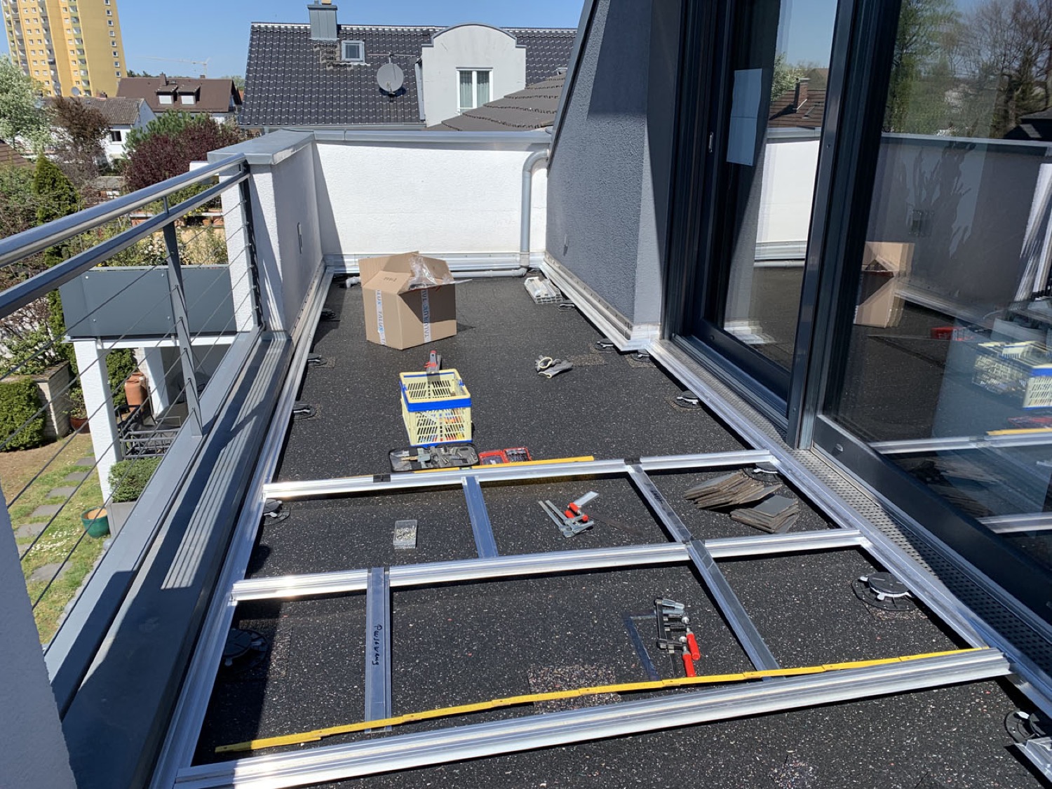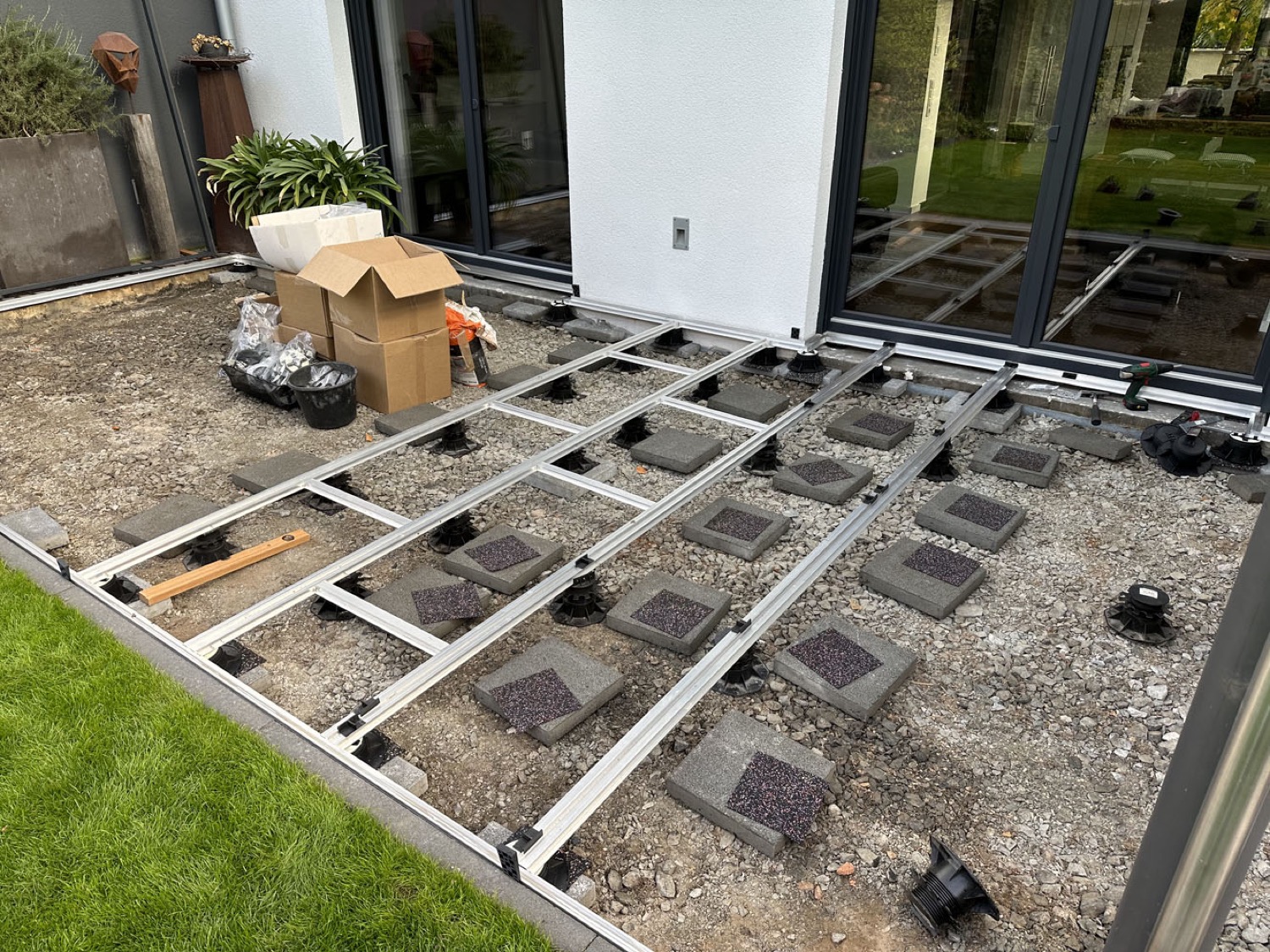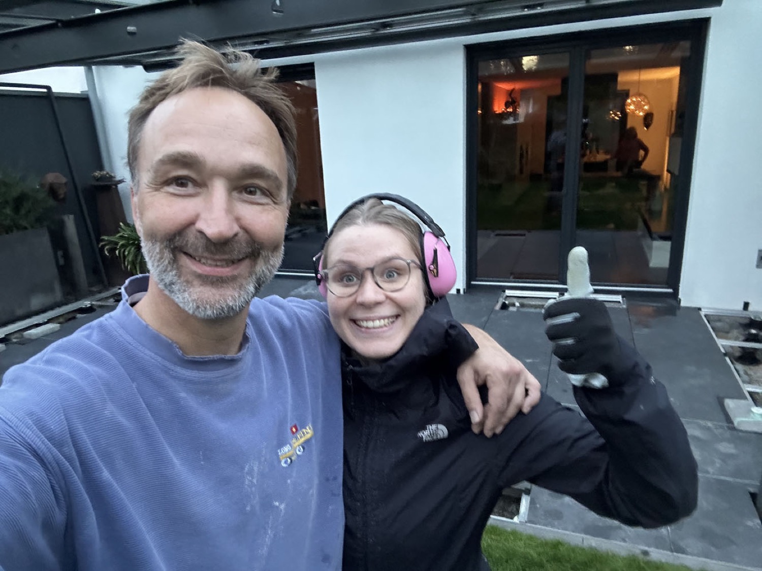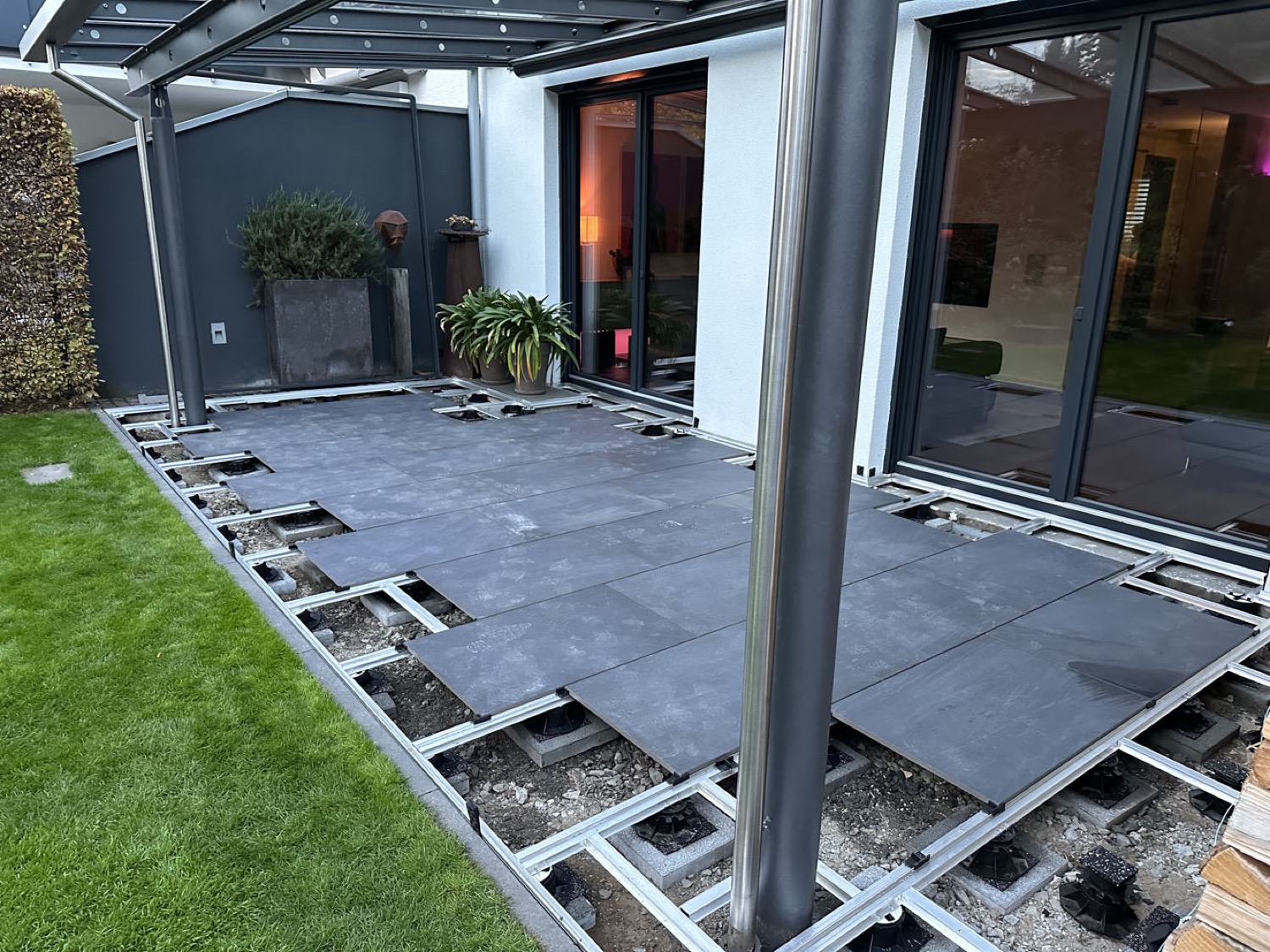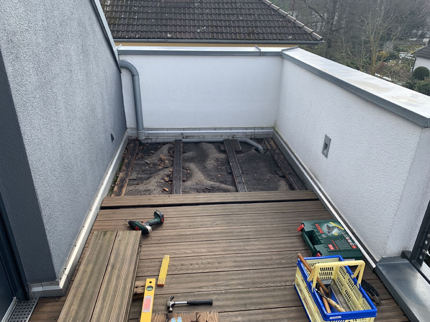 Am Haus haben wir in 2022 auch wieder etwas gemacht, nämlich das Holz auf der Terrasse und der Dachterrasse durch Platten ersetzt. Echte Gemeinschaftsarbeit!